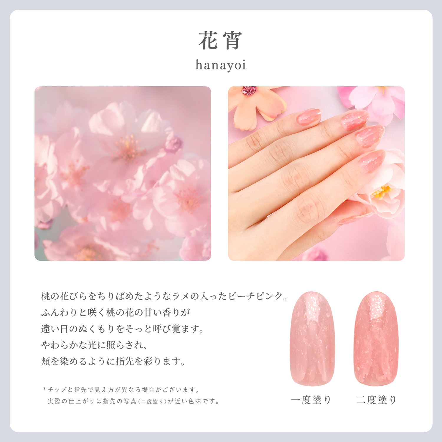 桃の花びらをちりばめたようなラメの入ったピーチピンク。