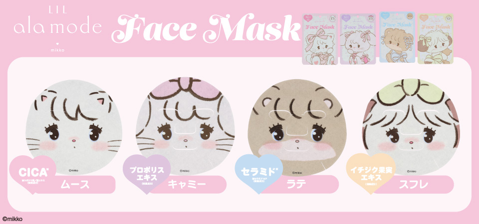 他の画像を見る NEW SNSで話題 Lil ala mode フェイスマスク 1枚入り <ムース/キャミー/ラテ/スフレ> リルアラモード 粧美堂 shobido お気に入りに登録する 販売価格 ¥ 495 税込