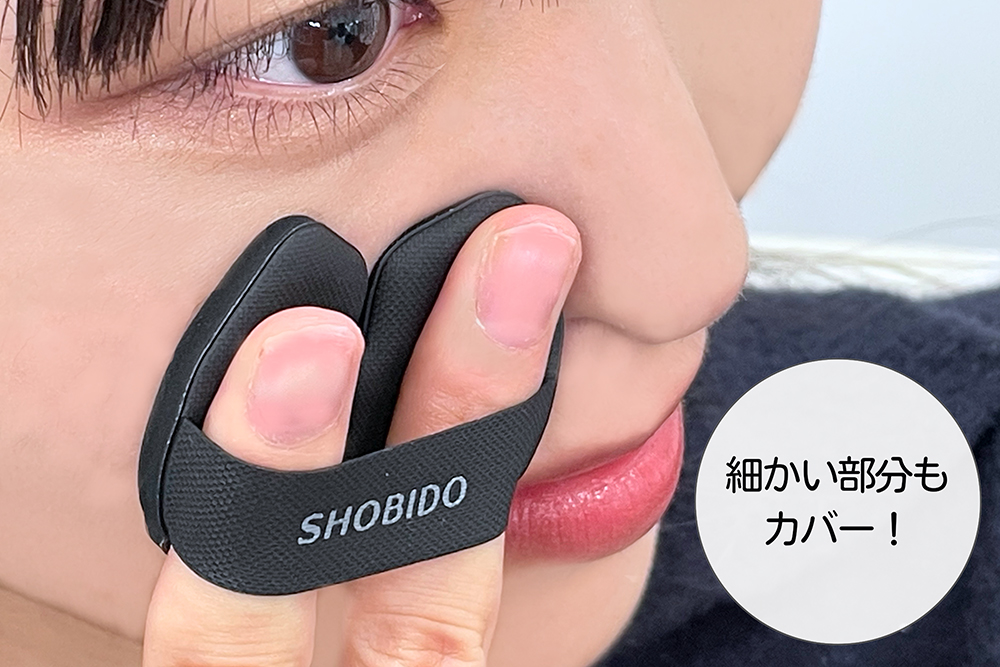 小鼻や目のキワなどの細部に便利な指サイズのパフと、全体を仕上げるのに便利な円形を組み合わせた形状で、このパフ1つで細部も広範囲もムラなくメイクすることが出来ます。
