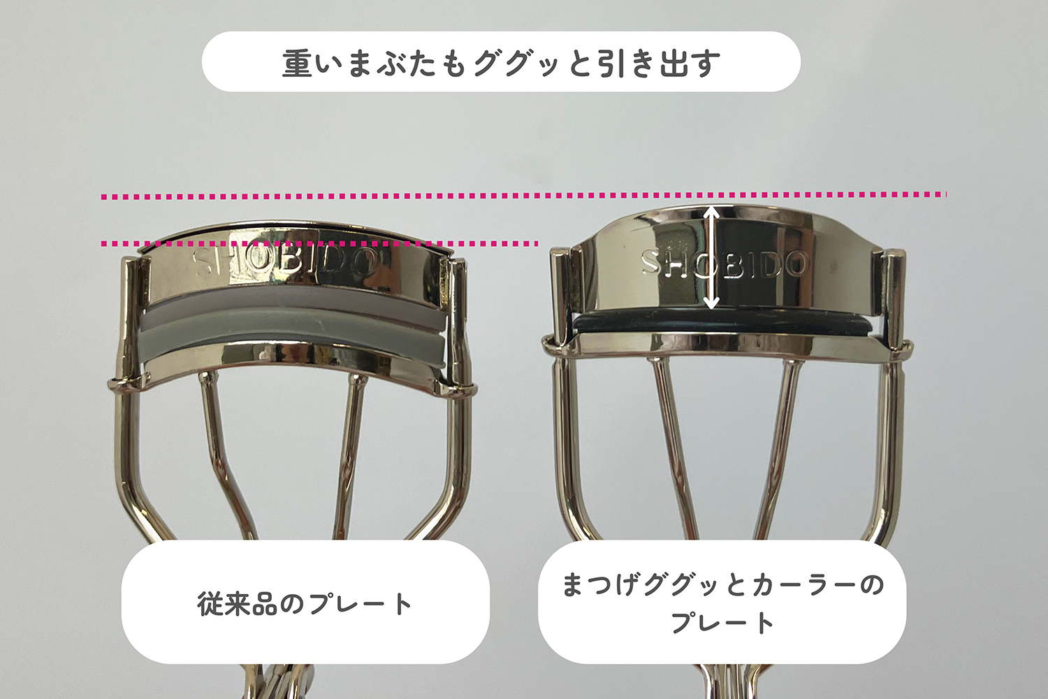 従来品のプレートよりも高さのある特殊プレートを採用した事で、重いまぶたもググっと持ち上げ、根元からシッカリとカールを作ることができます。