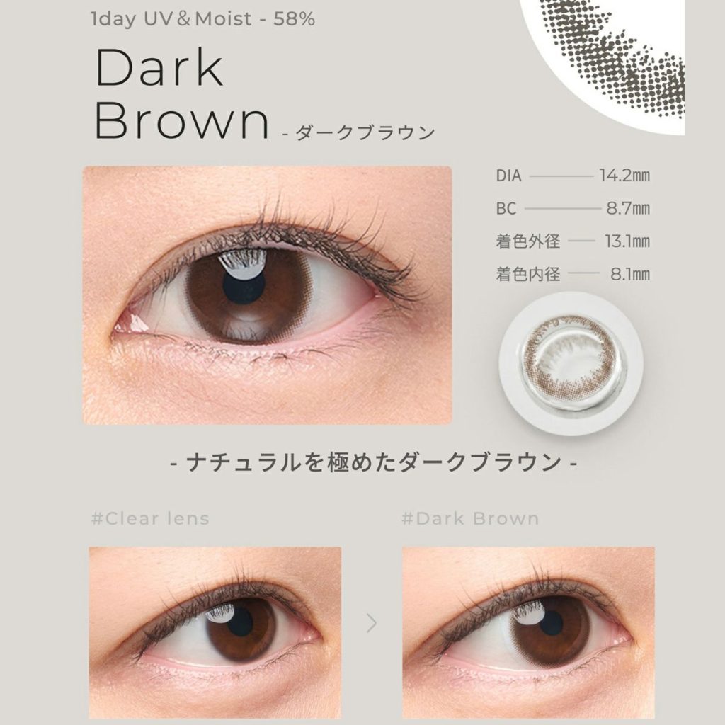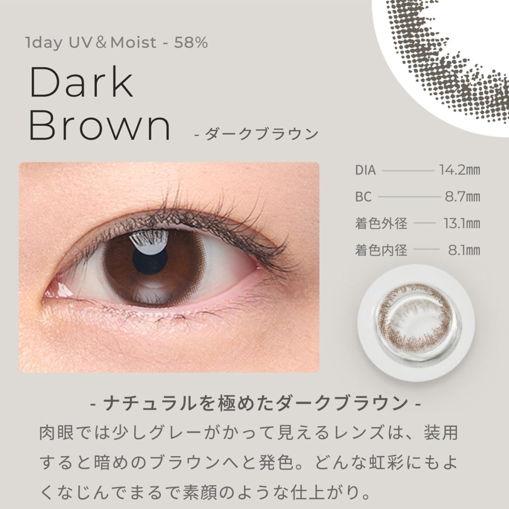 モイスト成分とUVカット機能をプラスした1Dayレンズ。潤い成分NPCポリマー配合で快適な装用感をサポートし、UV-Aを90%以上・UV-Bを99%以上カット。色素が直接触れないサンドウィッチ製法、乾きにくい低含水(38%)、汚れがつきにくい非イオン性素材で、1日中クリアな視界へ。カラーは自然なブラック、明るめオークル、艶ブラウンの3色。